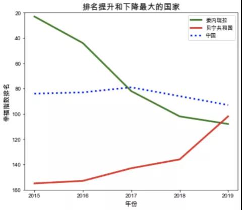 由可以看出,在所有國家中,幸福指數排名上升最快的國家是貝寧共和國,2015年到2019年間,從155升至102。而下降最快的是委內瑞拉,世界排名從23驟降到108。中國的變化較為平穩,一直處于80~90名左右。經過查閱相關資料可發現,近年來委內瑞拉經濟崩潰,通貨膨脹嚴重,民不聊生,食不果腹,因此其幸福指數必然暴跌。