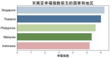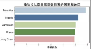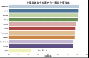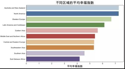 基于2015年的數據。將各區域的國家的幸福指數加總并計算平均值后,得到各區域的平均幸福指數。澳大利亞和新西蘭、西歐以及北美的平均幸福指數最高,幸福指數最低的三個區域是東南亞、南亞和撒哈拉以南的非洲地區,對比中國與幸福指數前十的國家,可以看到中國的幸福指數排名為世界中游水平。