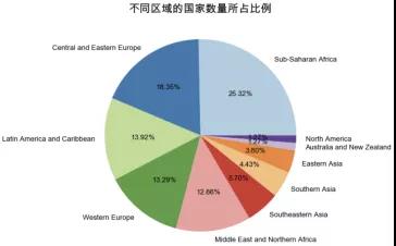 世界幸福報告是一項關于全球幸福狀況的里程碑式的調查。報告回顧了當今世界的幸福狀況,并展示了新的幸福科學如何解釋個人和國家的幸福變化。幸福感評分和排名使用了蓋洛普世界民意調查的數據。這些分數是基于對民調中主要生活評價問題的回答而得出的。 下面我們將帶著以下的一些疑問,來進行數據分析: (1)哪些國家或地區在整體幸福感方面排名最高,而影響幸福感的重要因素有哪些? (2)在2015年、2016年、2017年、2018年、2019年的報告之間,國家/地區的排名或分數如何變化?有沒有哪個國家的幸福感顯著提高或降低? (3)中國幸福指數是如何變化的? 01 全球幸福指數概況 全球幸福指數涵蓋了150多個國家和地區的調查結果,顯示了不同國家的幸福指數高低。我們可以發現大部分幸福指數高的國家基本集中在澳大利亞和新西蘭、北美、西歐地區。 02 各區域概況 全球所有國家可分為十個區域,包括撒哈拉以南非洲、中東歐、拉丁美洲和加勒比、西歐、中東與北非、東南亞、南亞、東亞、澳大利亞和新西蘭以及北美。如圖所示,其中撒哈拉以南的國家眾多,占到總數的25%左右,大洋洲只有澳大利亞和新西蘭,而北美只包括美國和加拿大。