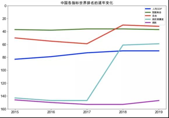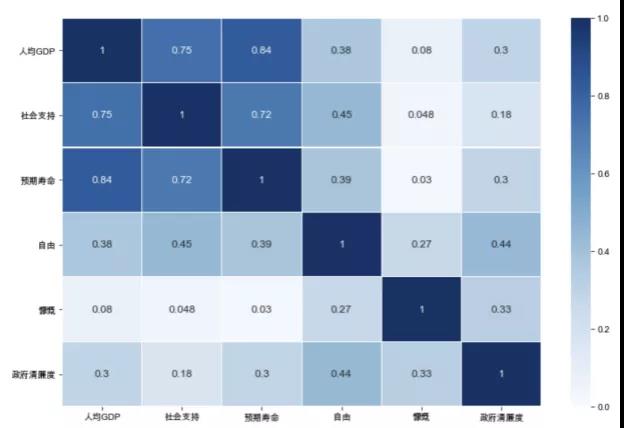 東南亞各國除了新加坡外的幸福指數排名處于世界中游。雖然并不理想,但相比于中國還是略高的。新加坡、泰國、菲律賓、馬來西亞、印度尼西亞的世界排名分別為:34,52,69,80,92。 中、東歐的總體水平雖然不如其近鄰西歐,但是依然處于世界前列。這份報告中東歐包含了部分中亞國家的成員國,這里所謂的東歐指實際上的中亞部分國家。車臣、斯洛伐克、波蘭、烏茲別克斯坦、立陶宛的世界排名分別是:20,38,40,41,42。 國外的報告熱衷于將臺灣和香港單列出來,這份報告也不例外。東亞國家和地區屈指可數,而我國卻不能居前五,只能說明我們仍需努力。臺灣、韓國、日本、香港和蒙古的全球排名分別為:25,54,56,78,83。 南亞諸國一直以來都是第三世界國家,其幸福指數也確實不夠理想。巴基斯坦、不丹、尼泊爾、孟加拉國、斯里蘭卡的全球排名分別是:67,95,100,125,130。 撒哈拉以南的非洲各國經濟落后,社會發展程度不高。毛里求斯、尼日利亞、喀麥隆、加納、科特迪瓦全球排名為:57,85,96,98,99。 我們發現幸福指數很高的這些國家都為發達國家,有可能是因為這些國家的人口基數少,發展精工業,社會制度以及良好的醫療保障等等因素。而一些發展中國家,例如中國,印度等國家處于中游水平,而幸福指數最低的幾個國家大部分都集中在非洲地區,可能是因為,非洲地區的經濟效益不好,戰亂等因素導致的。下面我們研究各個指標對幸福指數的影響,看看什么指標對幸福指數是影響最大的,換句話說,什么能使人民感到幸福? 我們對合成幸福指數所用到的分數進行相關系數的計算可以發現,人均GDP與社會支持和預期壽命之間具有高相關,相應的社會支持和預期壽命也存在高相關。自由與其他因素只有中等程度的相關,而慷慨(捐款)、政府清廉度與其他因素的相關度都不高。 上述的結果表明,經濟可能對預期壽命和社會支持都有很強的影響,自由在一定程度上會影響其他因素,而捐款和政府的清廉程度與其他因素的關系并不明顯。 由此可推論,發展經濟是促進幸福的硬道理,無論是預期壽命還是社會支持都要有經濟基礎。政府要保持一定程度的清廉才能有利于其他方面的發展,保證人們的自由也是為幸福提供保障,為其他方面得以發展的必備條件。 04 中國幸福指數分析 我們將中國在各指標上的得分與該指標上得分最高的十個國家進行對比,分析中國排名落后的原因。對人均GDP的分析可以發現,中國的人均GDP排名全世界第70位,據此來看,中國在發展中國家的地位是穩穩當當。 我國的社會支持在世界排名中為108名。有人說如今的中國社會人情淡漠,缺乏人與人之間缺乏互助精神,這可能是由于我國人口眾多,資源有限,競爭激烈造成的。人們都在忙于為自己的生活奔波,沒有時間去顧及別人。一帶一路在世界范圍內交朋友,我們是不是該先想想,怎么和身邊的人交朋友呢? 我國的預期壽命排名世界第37,可以說是很了不起的成績了。試想發展中國家這么多,我們卻能在預期壽命上處于世界前列。說明我國在醫療領域和民生領域的建設上發展迅速。 我國的自由指標的世界排名為32,可以說即使我們有看不見的墻,有諸多言論方面的管控,可是我們已經享有了很高程度的自由。自由對營商的重要性不必多言,市場經濟能高效運轉,自由是前提。 我國的捐款指標的世界排名僅為147,這一點可能是拖累我國幸福指數的最大原因。我們的公益事業發展狀況很不好,沒有形成規模較大且靠譜的公益組織,相關的人才隊伍也沒建設起來,民眾的捐款意識也不強??赡艿脑蚧蛟S是政府包辦了許多工作,更可能與我國沒有做公益的文化有關。希望未來這一情況得以改善,讓社會充滿愛。 我國的政府清廉度排名為59,這說明近幾年中央主持的反腐工作還是比較到位的,同時也說明,我國過去的腐敗情況確實堪憂。 對過去五年的中國在各指數上的全球排名的變化可以發現,預期壽命基本保持不變,人均GDP緩步上升,政府清廉度急速上升,捐款狀況在低位徘徊,人民自由先降后升??梢苑从吵觯覈姆锤窢幊煽兿踩?,經濟建設還需努力,民生醫療建設成果要繼續保持,為了更好的發展,我們需要更高質量的自由。 為什么反腐進步如此之大卻沒有使我國的幸福指數進步巨大?是因為在18和19年計算幸福度時,相比于之前,去掉了一項占比非常大的分數(反烏托邦指數)造成的。 05 結論 結合上述分析,我們可以發現發達國家的幸福指數普遍比發展中國家高,因為發達國家的經濟水平較高,而無論是預期壽命還是社會支持都要有有經濟基礎,經濟的發達程度,可能在很大程度上影響了幸福指數的評分,所以我們應該大力發展經濟,增加人民幸福感。 但是,這并不意味著只要經濟發展了就一定會幸福。經濟發展是一個可以量化的指標,人們的確能夠從財富的增長中獲得一些幸福,但是還有許多因素,例如:房價飛漲,物價上漲,環境污染也會影響人們的幸福感。比如說2008年,房價迅速攀升,盡管人們的收入也提高了不少,但總也趕不上房價上漲的速度,現在全民都在關注房價的問題,在這種情況下很難談的上幸福指數的提高。 所以,經濟發展固然重要,但是我們也不能一味的發展經濟,在發展經濟的同時也要提高各方面的綜合素質,比如,降低失業率,為人民提供良好的醫療、社會保障等等。與此同時,政府需要保持清廉,才更有利于一